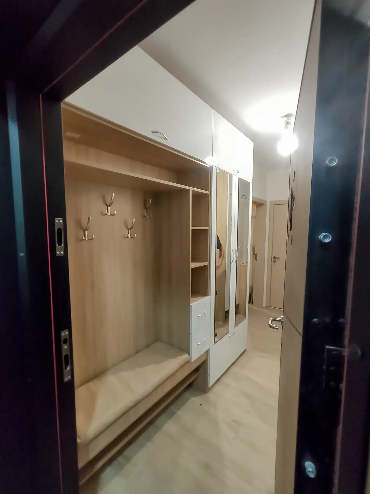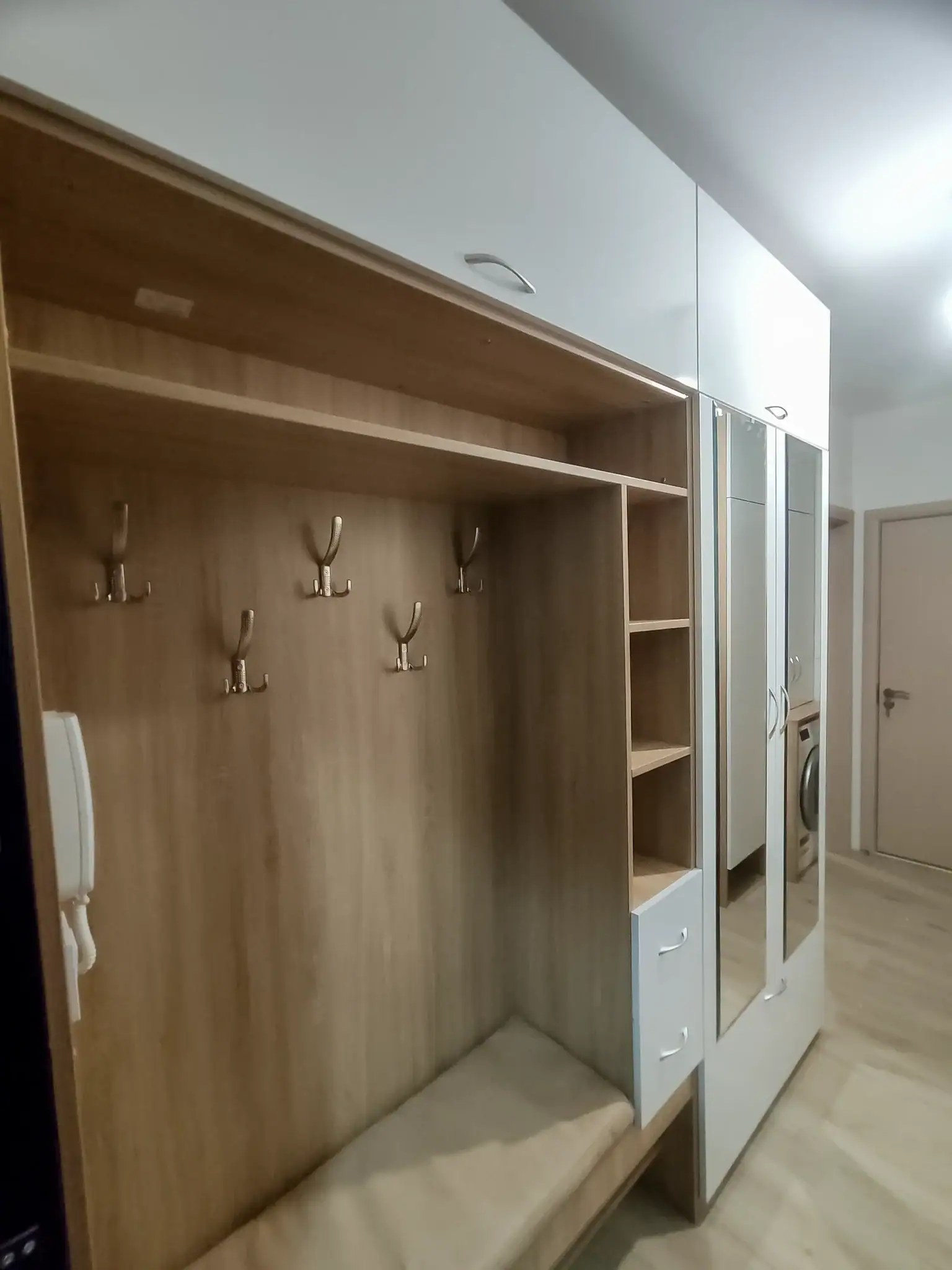 След успеха на жълтата кухня, клиентката отново се обърна към нас – този път, за да завършим уюта в новия ѝ апартамент. Семейството вече се беше настанило, всички стаи бяха обзаведени, и именно антрето остана последното звено – финалният щрих, който да подреди дома изцяло.