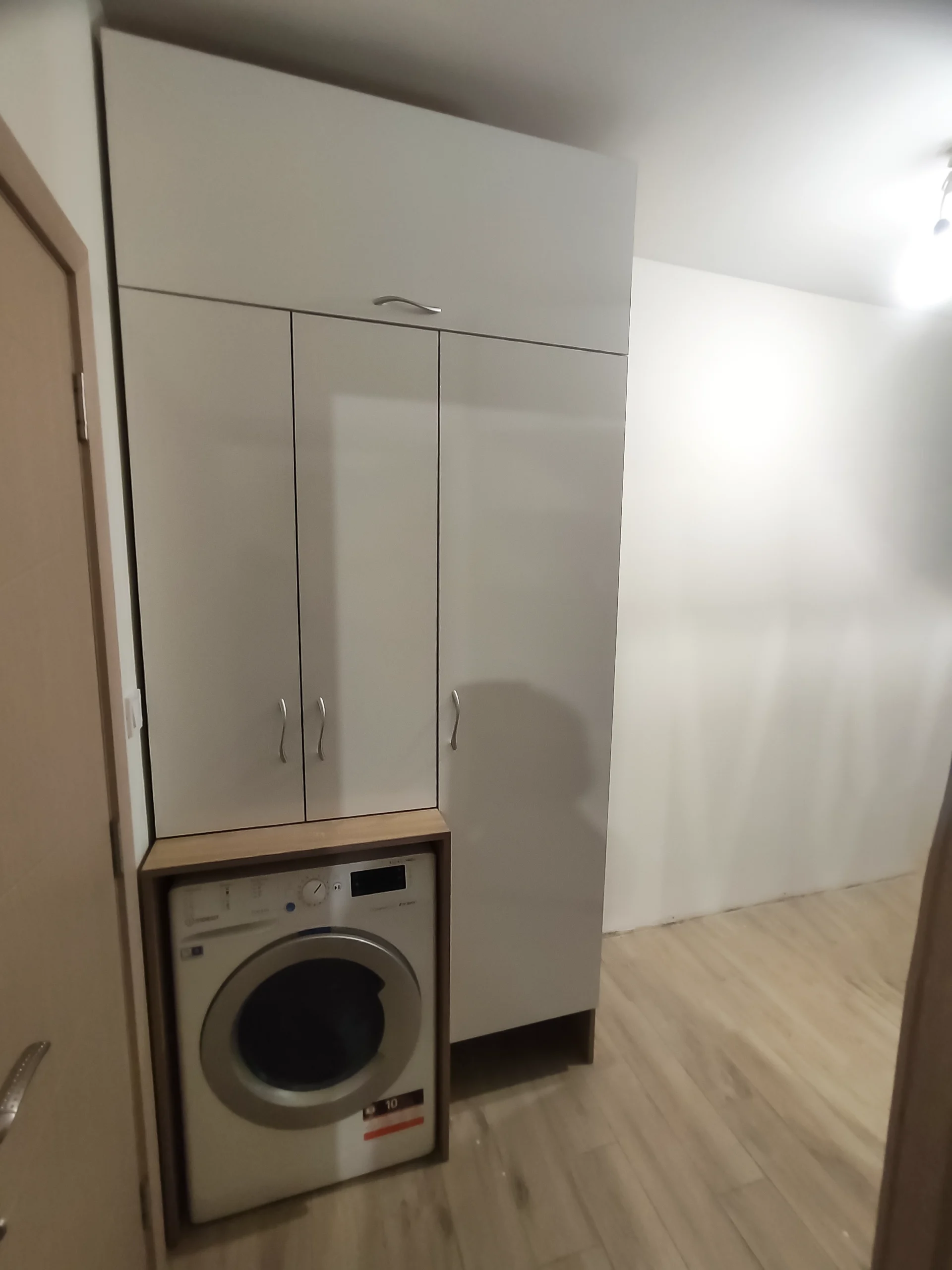 Задачата включваше две зони – отляво портманто с пейка и гардероб, а отдясно шкаф за пералня и почистващи препарати. Клиентката сподели, че иска място за прахосмукачка-робот, което да остане дискретно, но достъпно.