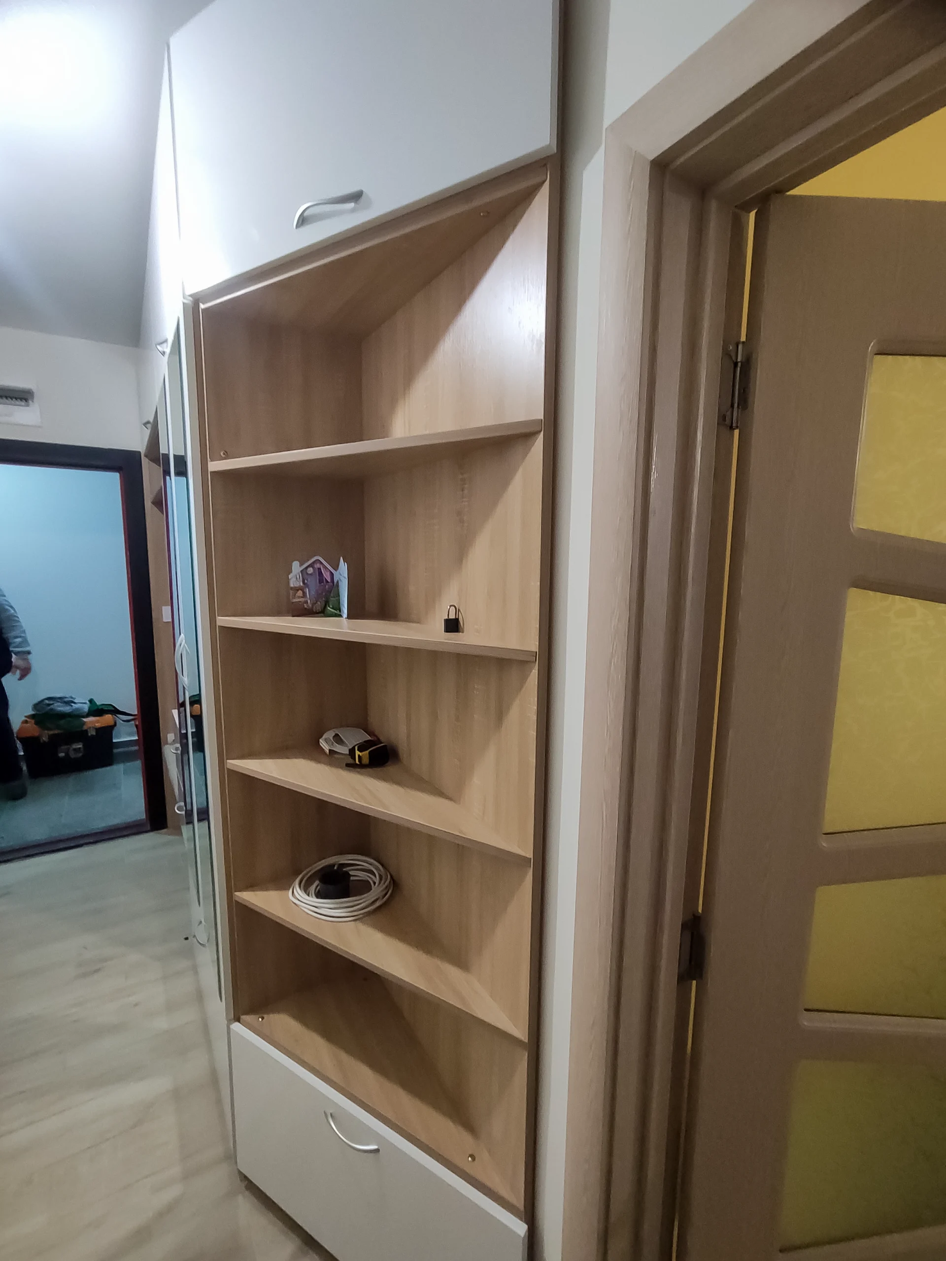 Заради ограниченото пространство и факта, че семейството вече живееше в апартамента, сглобихме основните модули предварително в нашата работилница. На място извършихме финалното нивелиране, монтаж на вратите и поставяне на обкова.
