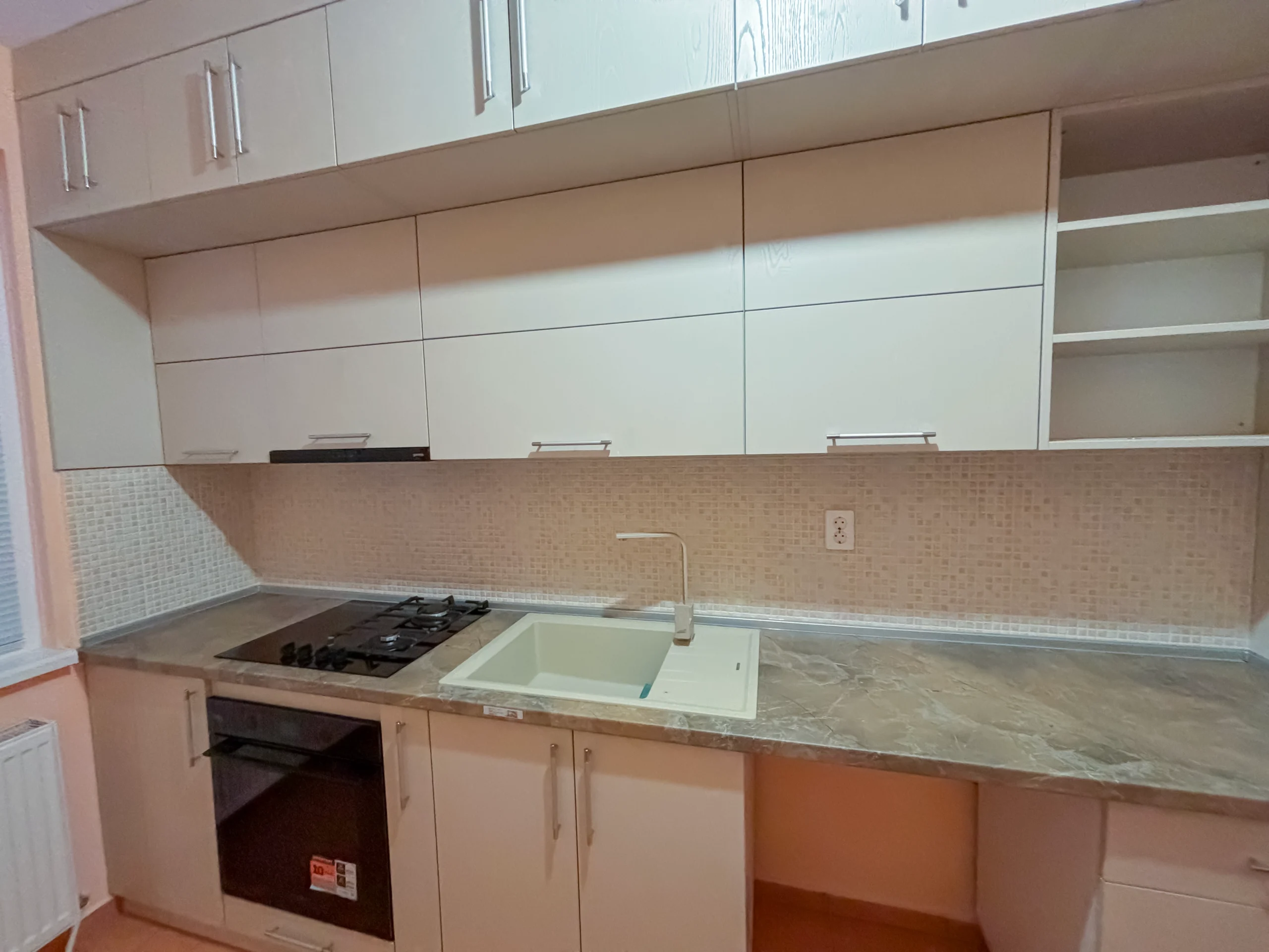 Радиаторът под прозореца се оказа единственият истински препъни-камък – дълбочината му не позволяваше да поставим стандартен шкаф с врата, а ако затворехме зоната с панел, щяхме да „изядем“ ценно пространство до прозореца, което иначе може да бъде използвано. Не искахме да губим този участък, защото той е важна част от общата линия на кухнята.