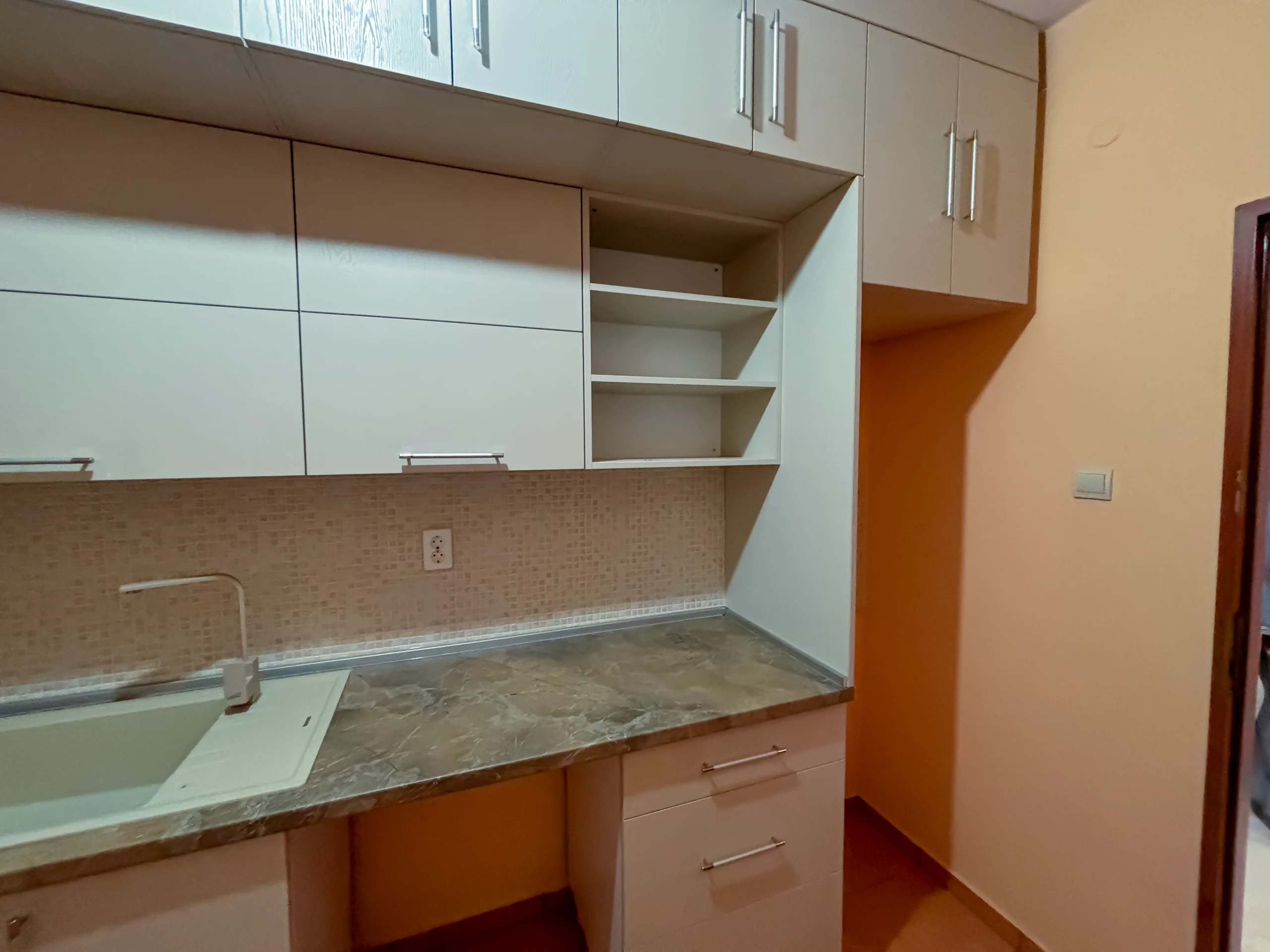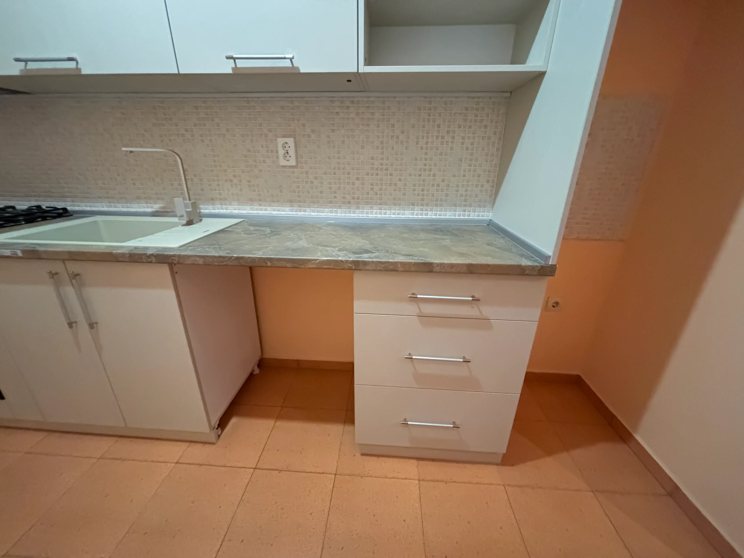 Още при първия оглед видяхме, че клиентите вече са задали посоката: поставили бяха жълти мозаечни плочки като гръб и бяха боядисали стените в мек прасковен тон. Палитрата беше топла, нежна и едноцветна — и ясно показваше, че търсят спокойна, монохромна кухня без силни контрасти.