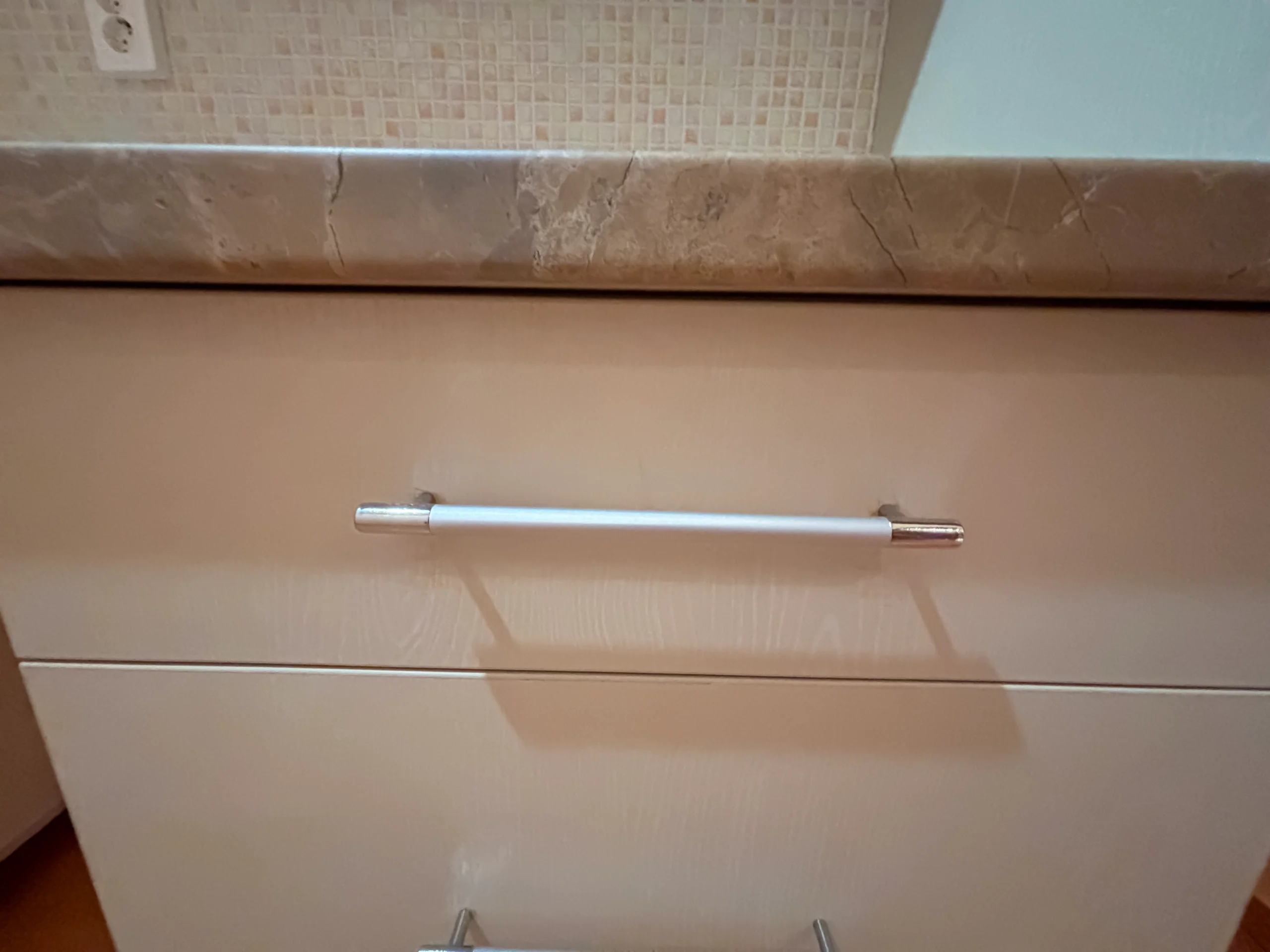 Шкафовете естествено поеха посоката на нежната палитра. Клиентите се спряха на бежов дървесен декор, който стоеше естествено върху прасковения фон и създаваше мека, едноцветна визия. За контраст избраха плот в по-тъмен каменен десен, който добавя характер, но остава ненатрапчив. Така композицията остана нежна, подредена и хармонична.