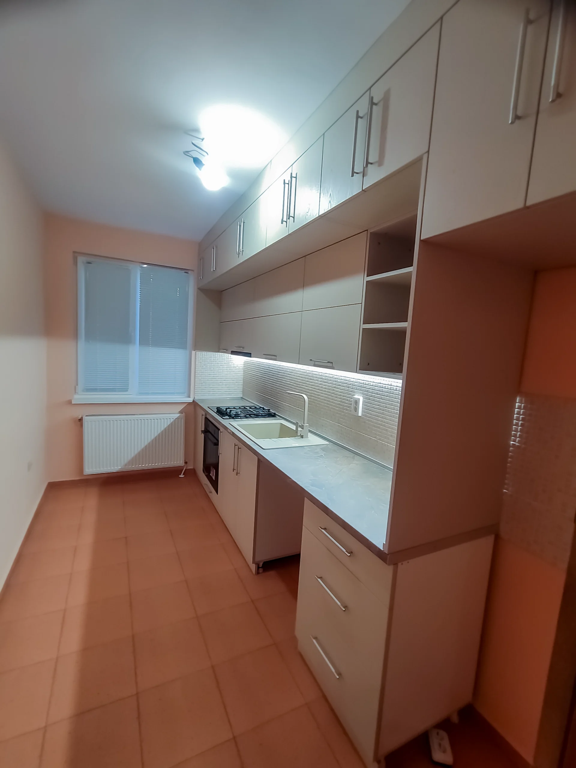Въпреки компактното пространство успяхме да поберем всичко важно за едно пълноценно ежедневие — пералня, фурна, плот, хладилник и дори шкаф с механизъм за бутилки и готварски прибори. Всички елементи се наредиха логично един до друг, така че кухнята да изглежда лека, подредена и напълно завършена.
