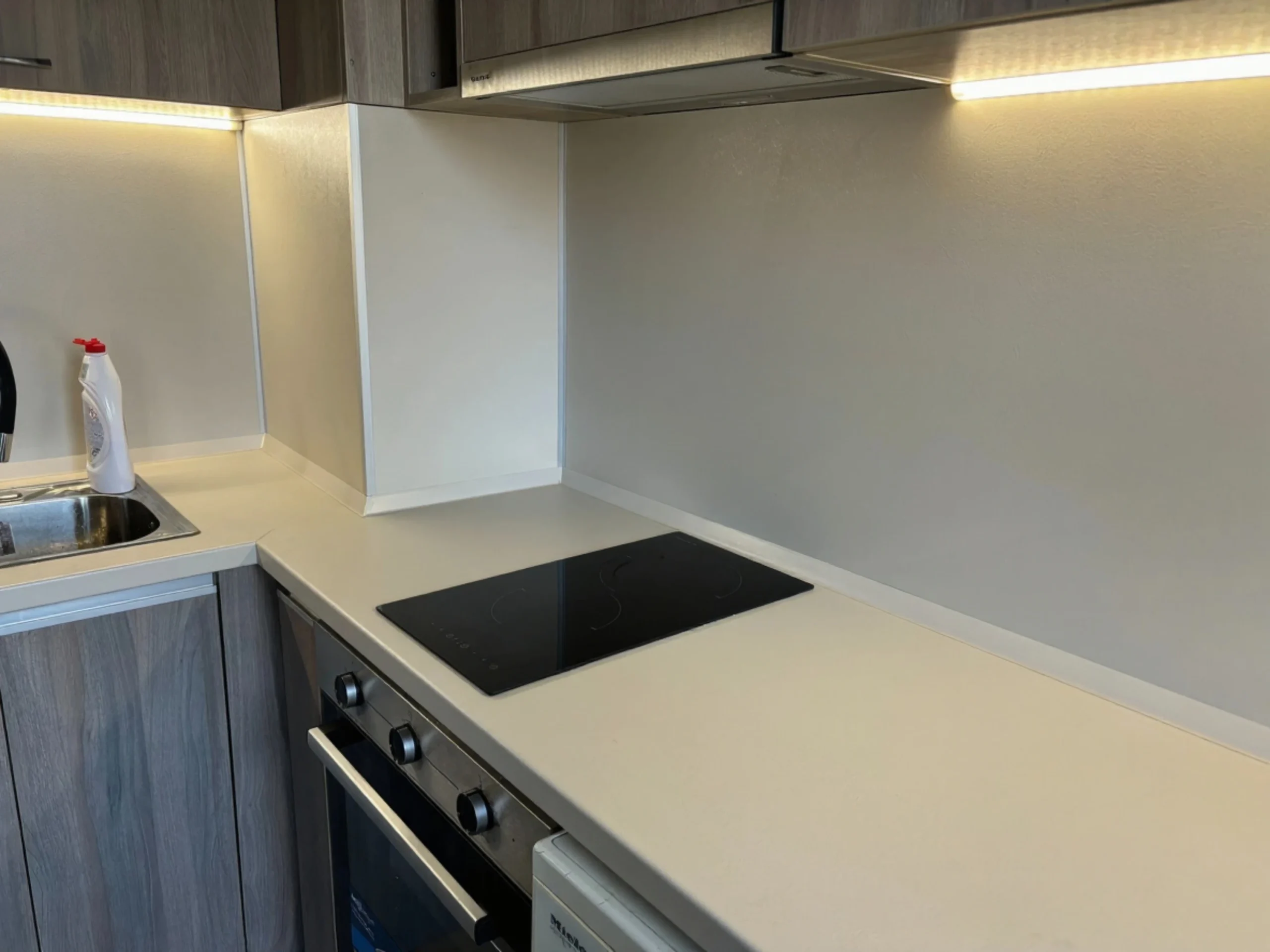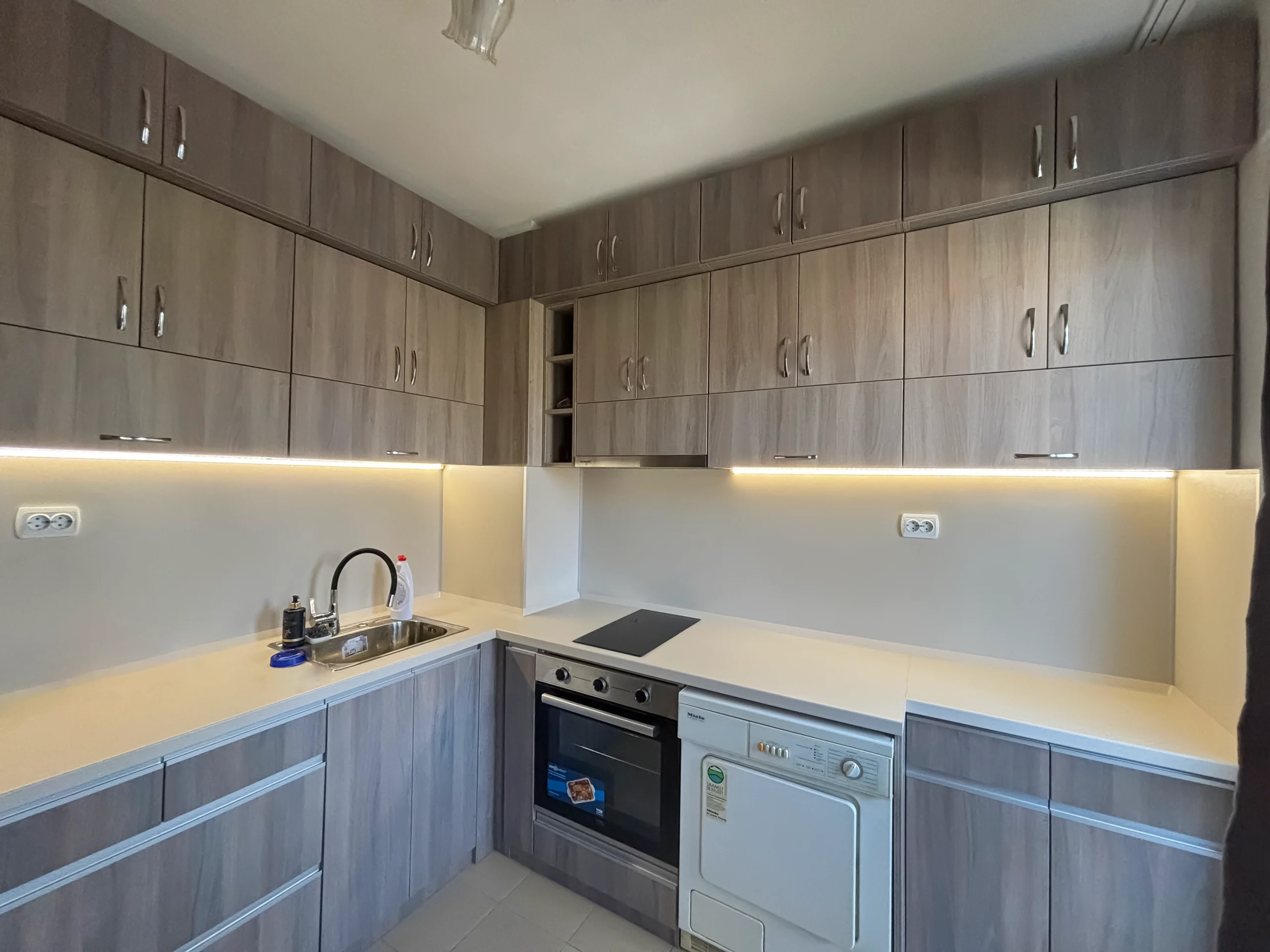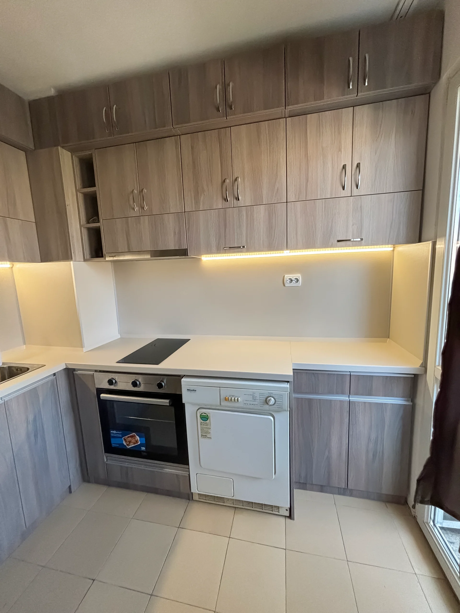 Въпреки компактното пространство, успяхме да подредим уредите логично – фурната и сушилнята по дългата стена, а хладилникът остана отделен, на стената срещу тях. Балансът между височини и пропорции беше ключов, за да се запази визуалната лекота на цялата композиция и усещането за подреден, спокоен интериор.