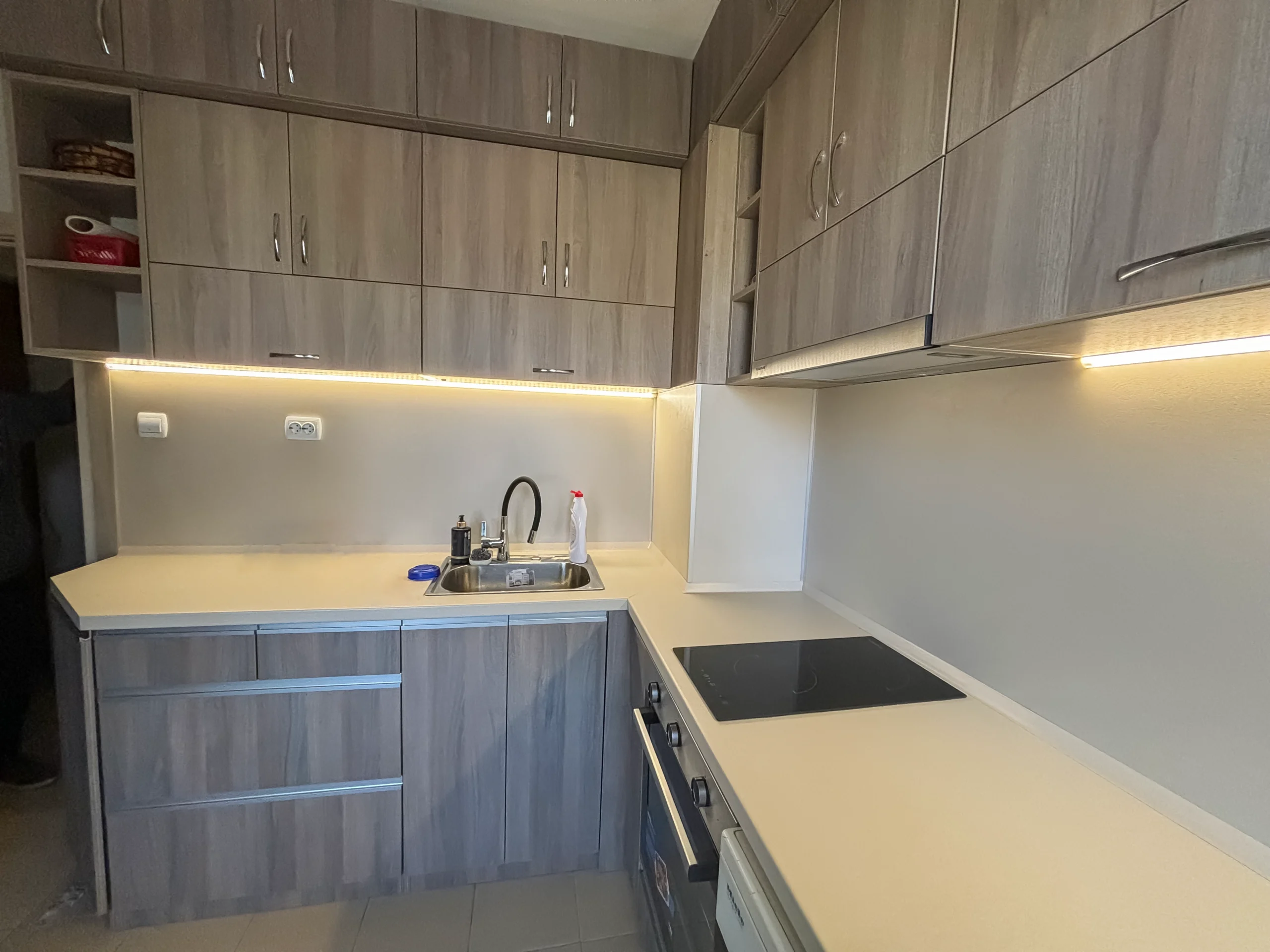 Семейство от Пловдив се свърза с нас по време на ремонта на стария си апартамент. Желанието им беше ясно – кухня по поръчка, която да съчетава практичност, топлина и усещане за уют. Съпругът, който работеше в чужбина, искаше жена му да има удобно и подредено пространство за готвене в обновения дом.