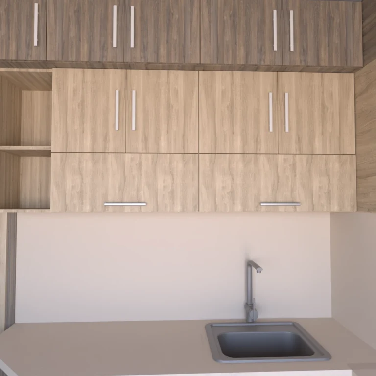 Семейството искаше кухнята да се свърже естествено с новата интериорна врата в светъл дървесен декор. Затова избрахме Златен бряст (Kronospan K017 PW) за горните шкафове – мек, златист нюанс, който носи светлина. За контраст долните и най-горните модули изпълнихме в декор Опушен бряст (Kronospan K018 PW) – по-дълбок нюанс, който придава стабилност и характер.