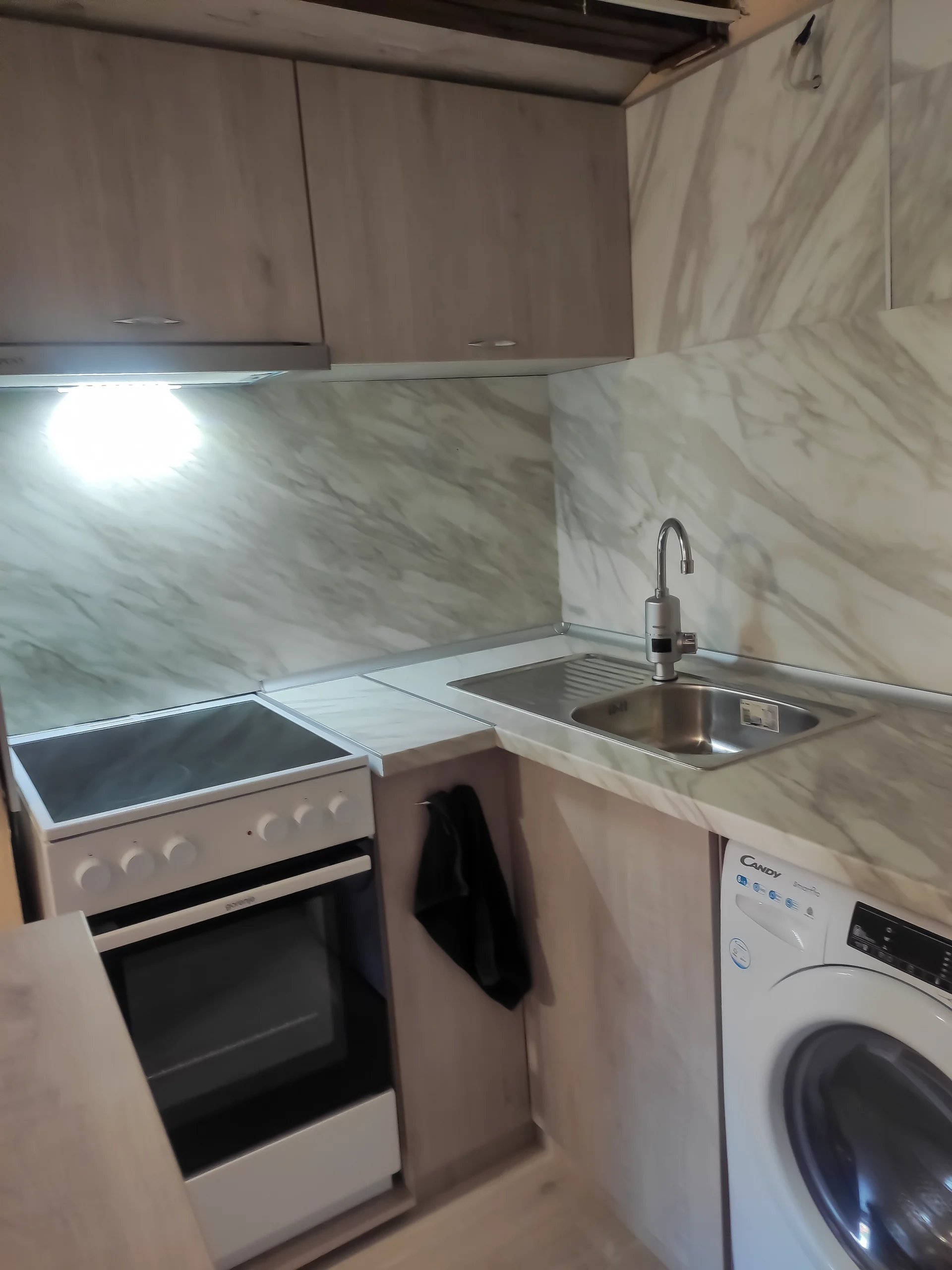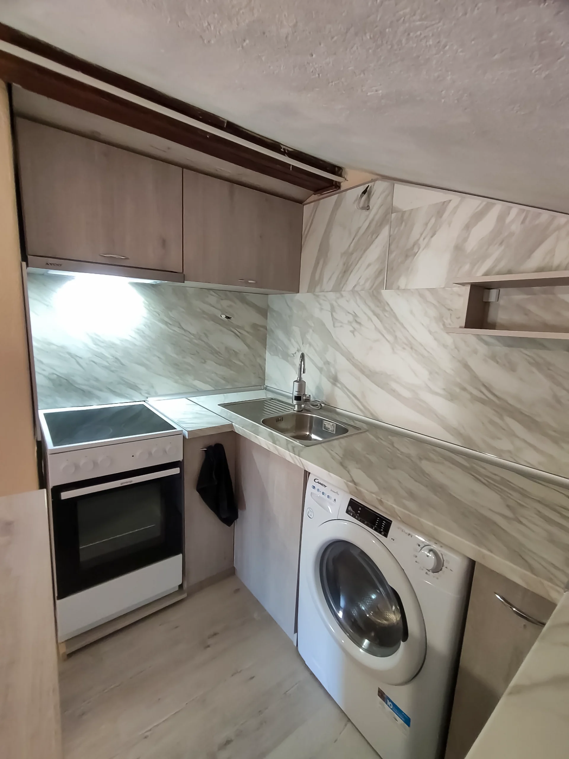 Въпреки това клиентката вярваше, че с правилен дизайн може да се получи дом, в който всеки детайл има значение. Тя и майка ѝ се бяха заели с ремонта сами, а нашата задача беше да проектираме мини кухненски бокс по поръчка, който да включва пералня, печка, мивка и достатъчно място за съхранение, без да нарушим усещането за простор.