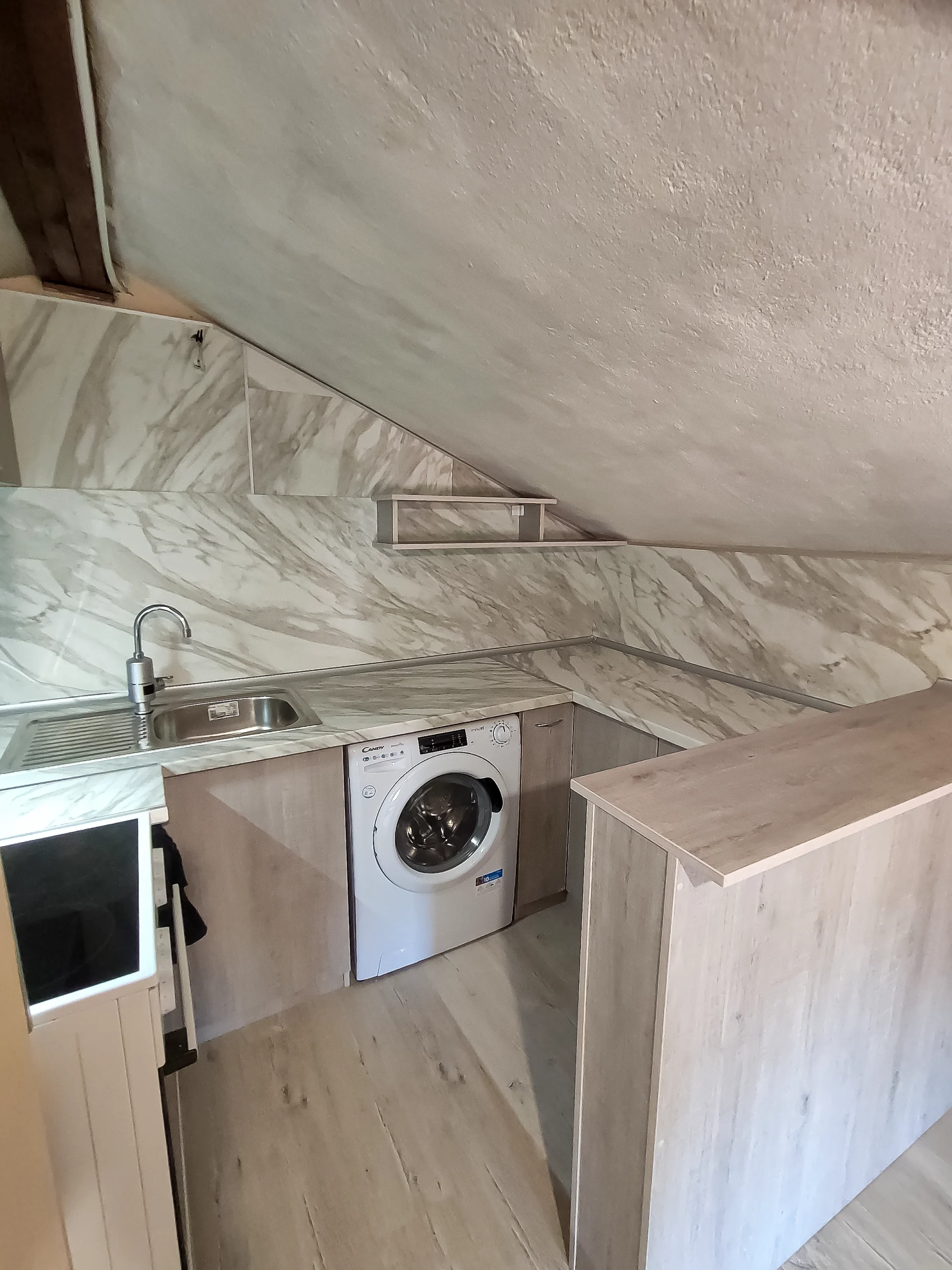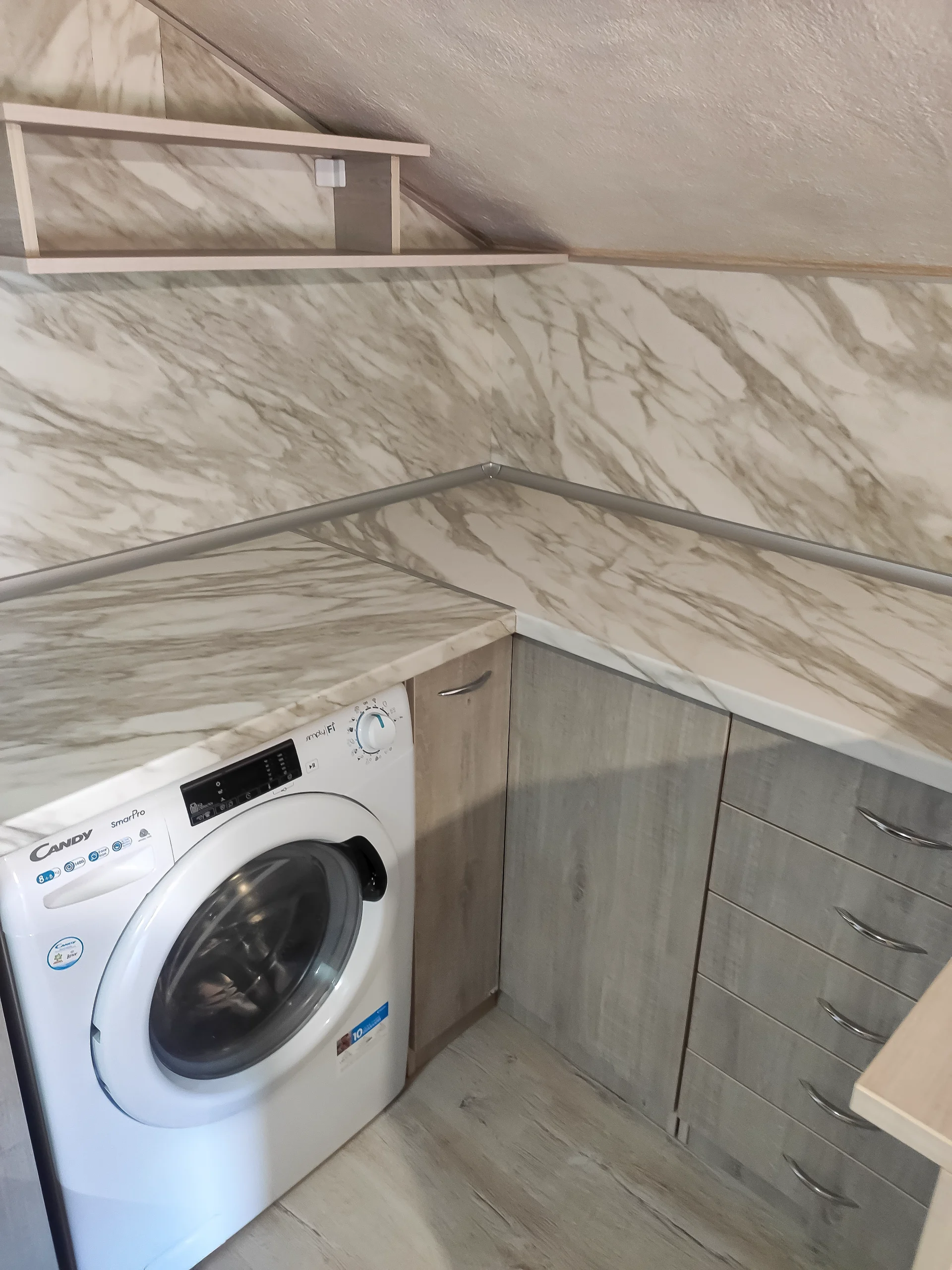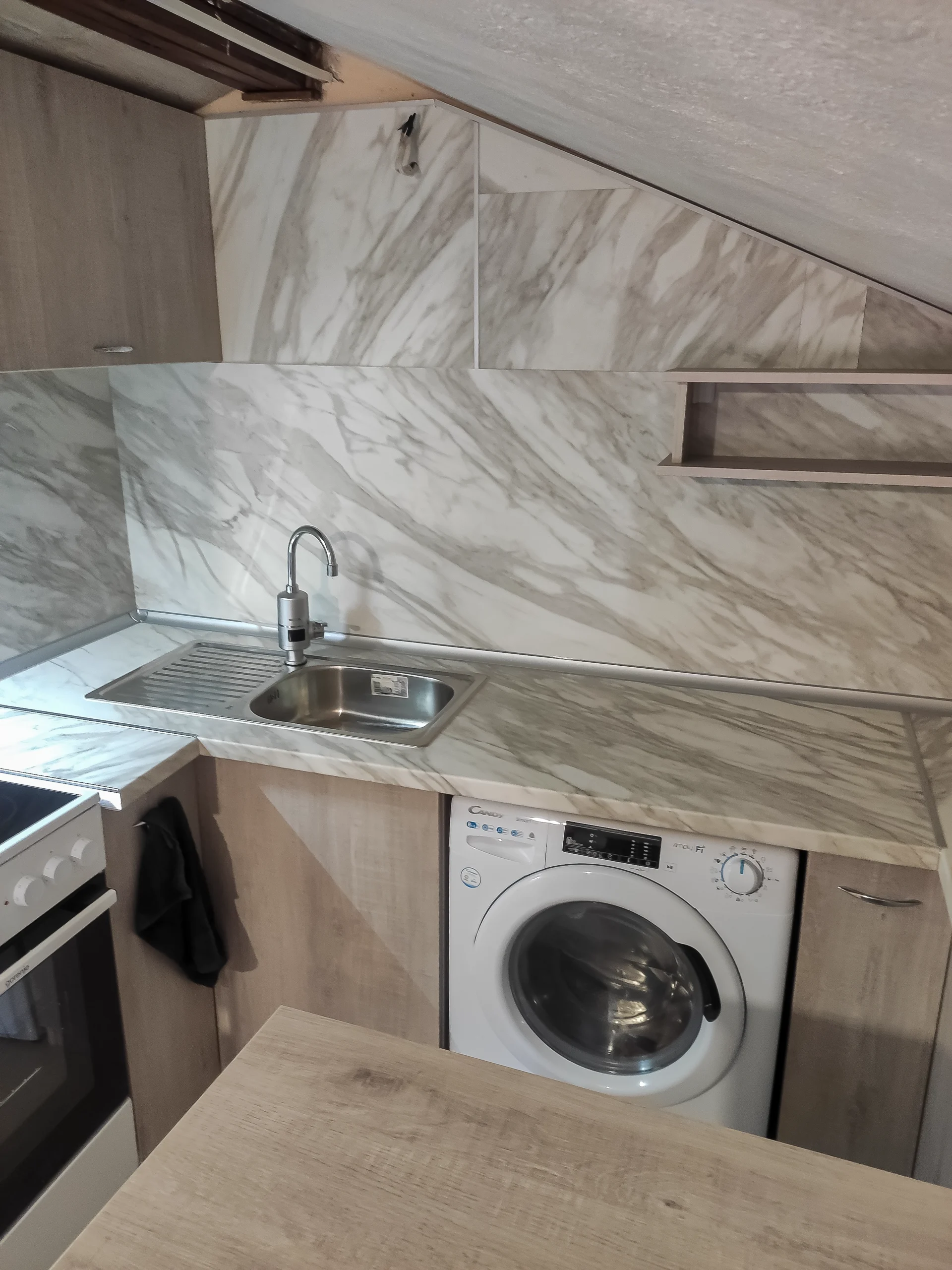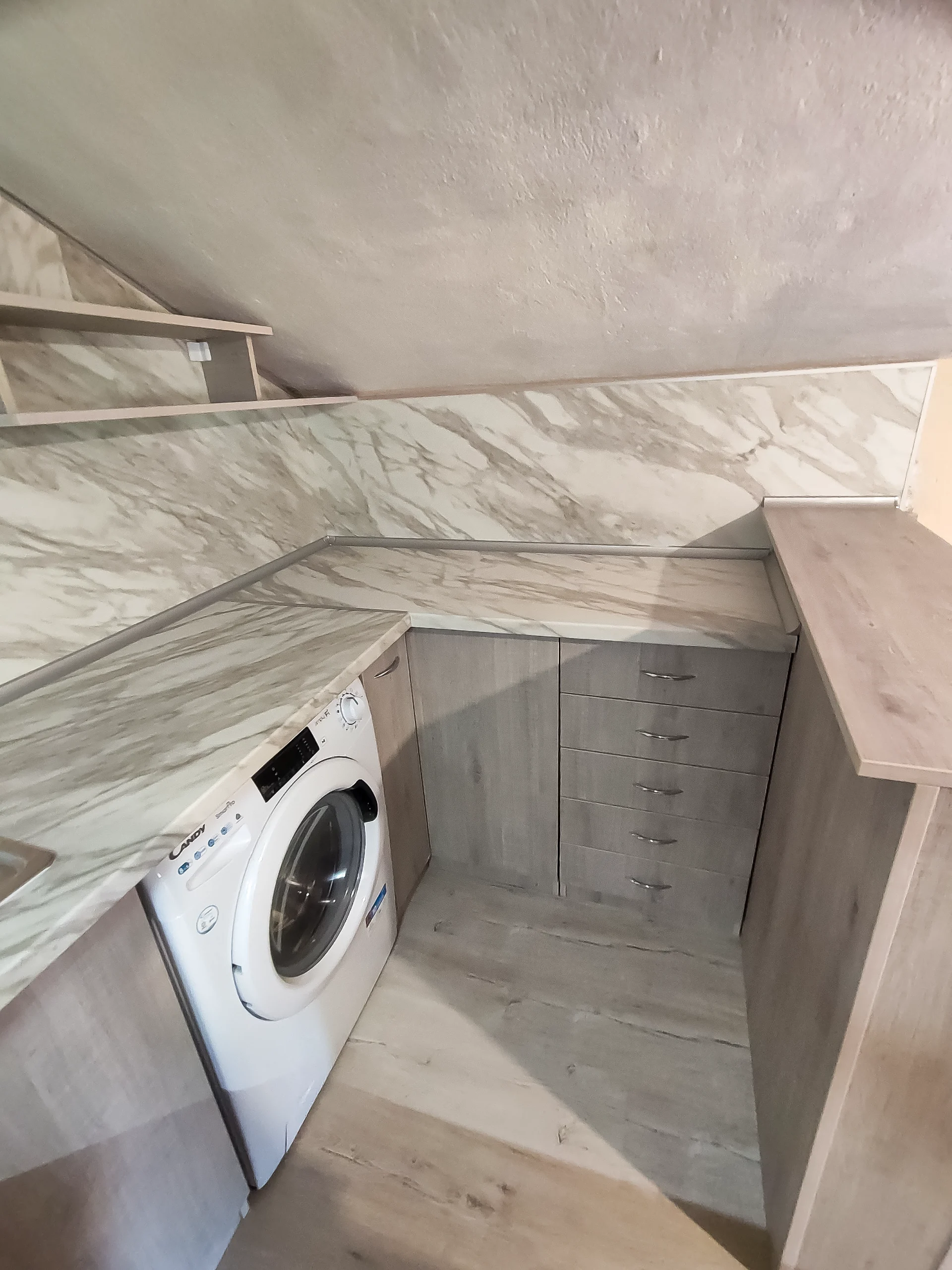 Монтажът на пералнята и мивката изискваше внимателно позициониране спрямо скосения таван, за да се осигури удобен достъп и свободно отваряне.